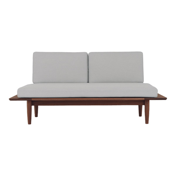 水平に伸びる一枚の板にクッションをのせた、アームのない軽やかなソファ。